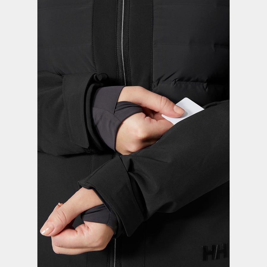 This sleek women's ski jacket is made for excellence. We designed it to inspire skiers to feel confident and take charge of challenges. Its warmth comes from PrimaLoft Black Eco insulation. H2Flow tech gives you breathability during exertion. The exterior is a soft 4-way stretch waterproof fabric. The silhouette is trim and looks great whether you're skiing or enjoying après ski. An adjustable powderskirt adds versatility and comfort for long days on the slopes.